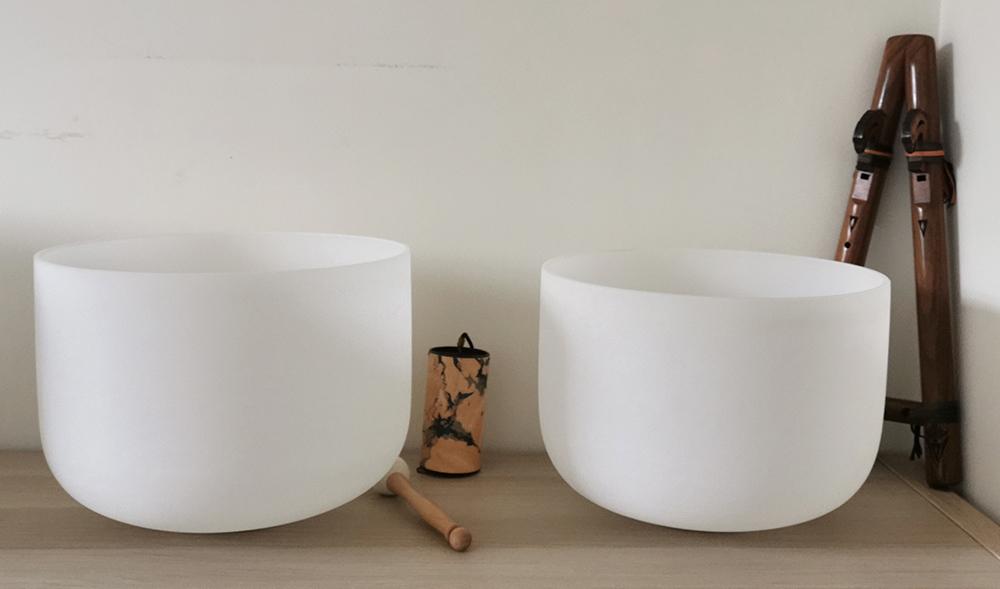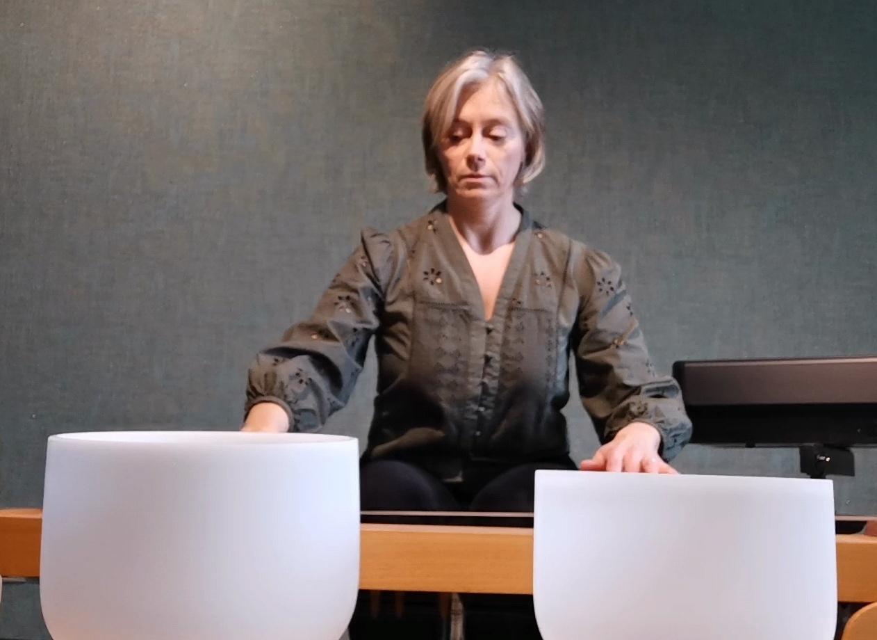 Naast het bespelen van kristallen klankschalen worden er andere instrumenten gebruikt in combinatie met Griet haar stem.